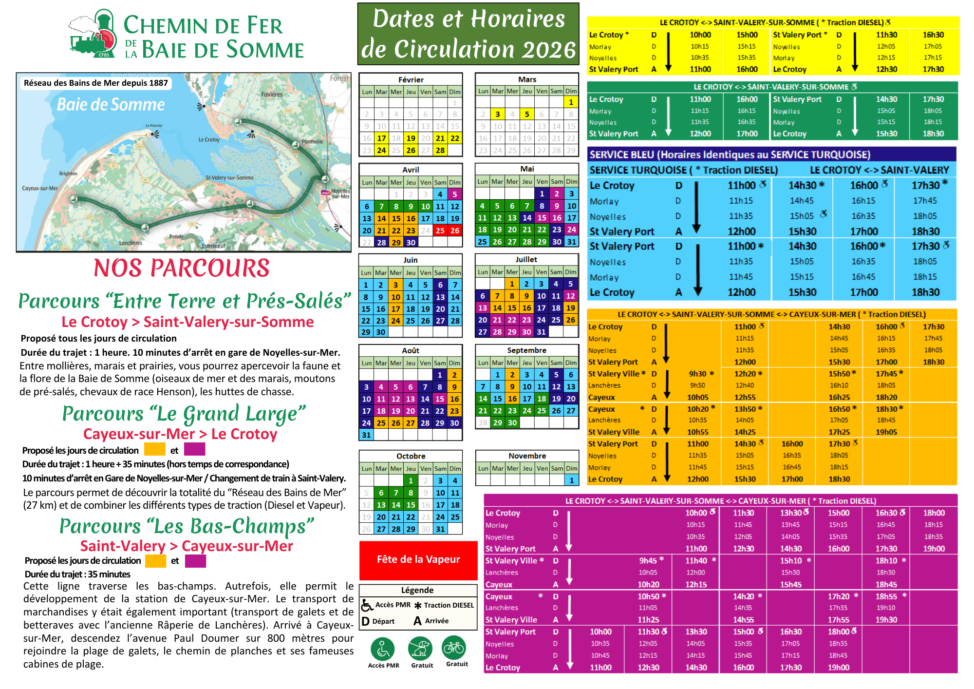 Les gares du Crotoy et de Cayeux-sur-Mer se situent à environ 800m à pied du centre-ville. Aucune navette n'est proposée depuis les gares pour rejoindre le centre-ville.