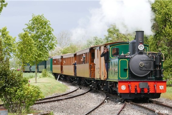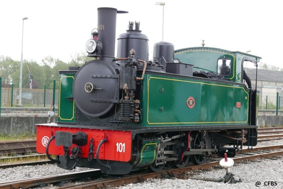 La locomotive N° 101, de type 030 T (3 essieux moteurs, pas d’essieux porteurs), a été construite en 1905 à Lyon par la société Pinguely, pour les Chemins de fer départementaux du Morbihan. En 1947, cette machine et l’une de ses sœurs sont vendues aux Forges de Gueugnon (Saône et Loire), où elles assurent les manœuvres de ce site industriel jusqu’en 1974. Les 2 locomotives sont ensuite achetées par la Fédération des Amis des Chemins de fer Secondaires (F.A.C.S.), et la 101 est confiée au CFBS.